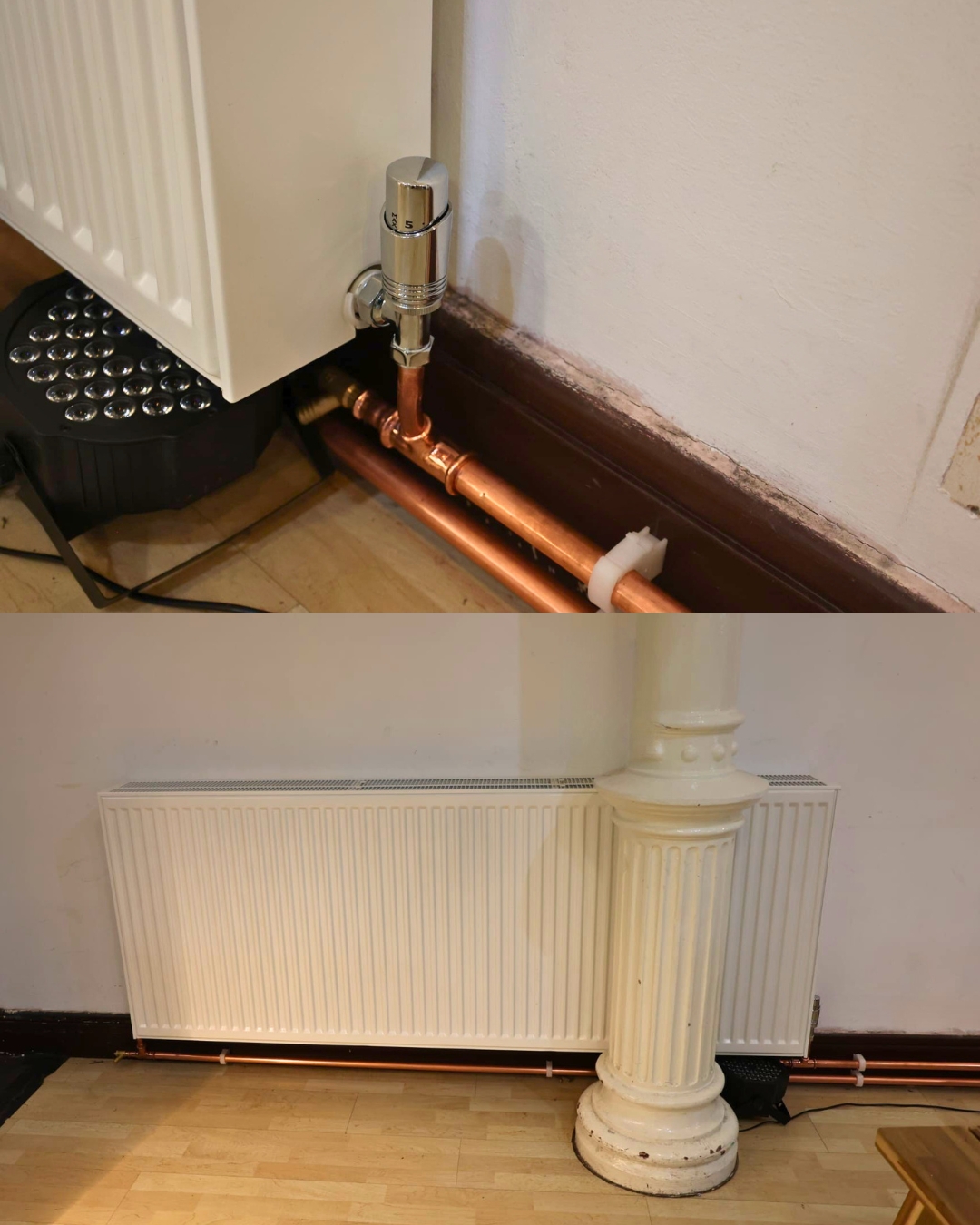 A multi-emitter approach was adopted to suit the layout of the property — ground floor underfloor heating provides efficient radiant heat at low flow temperatures, while Spire’s Macrobore HP system handles first floor distribution.