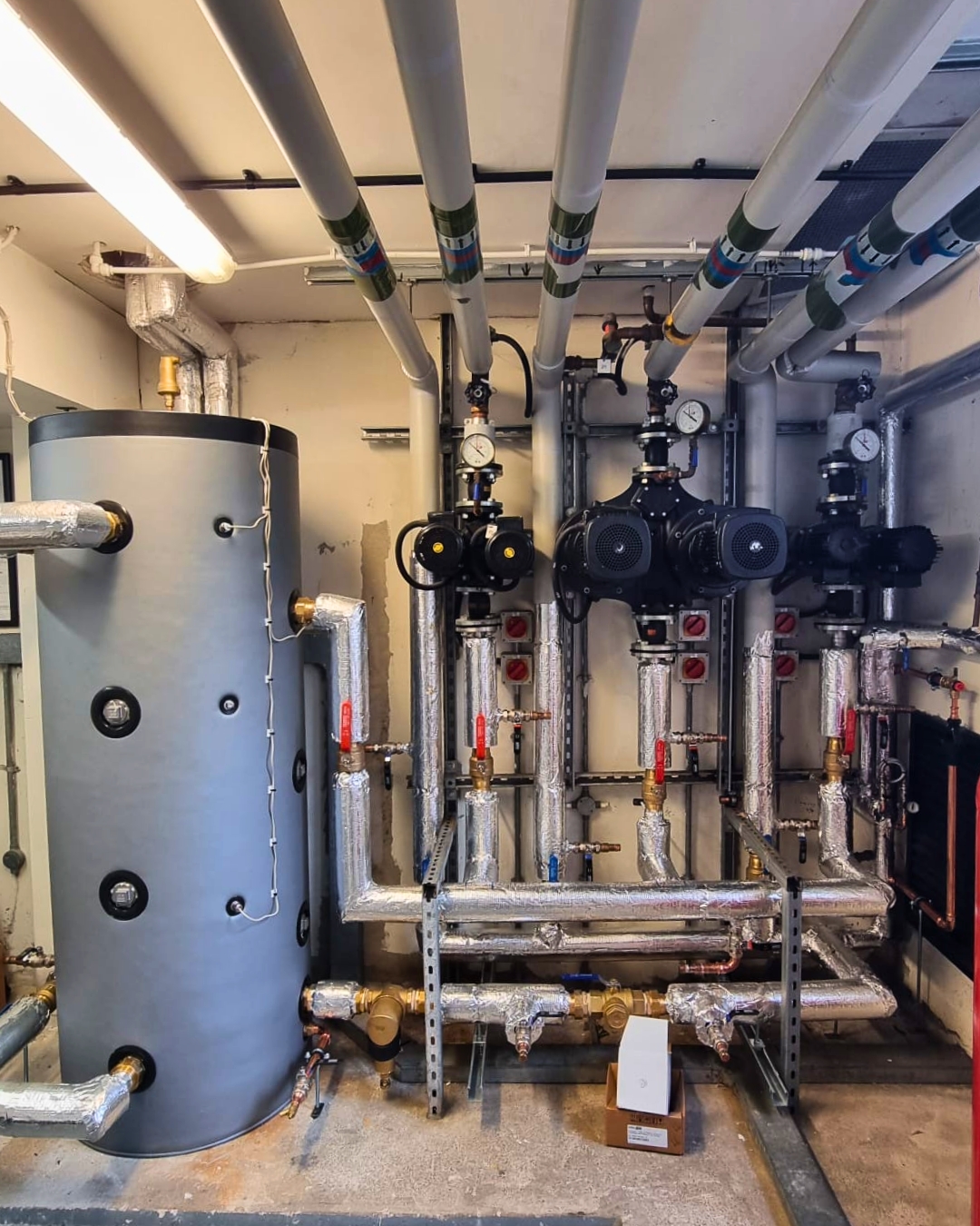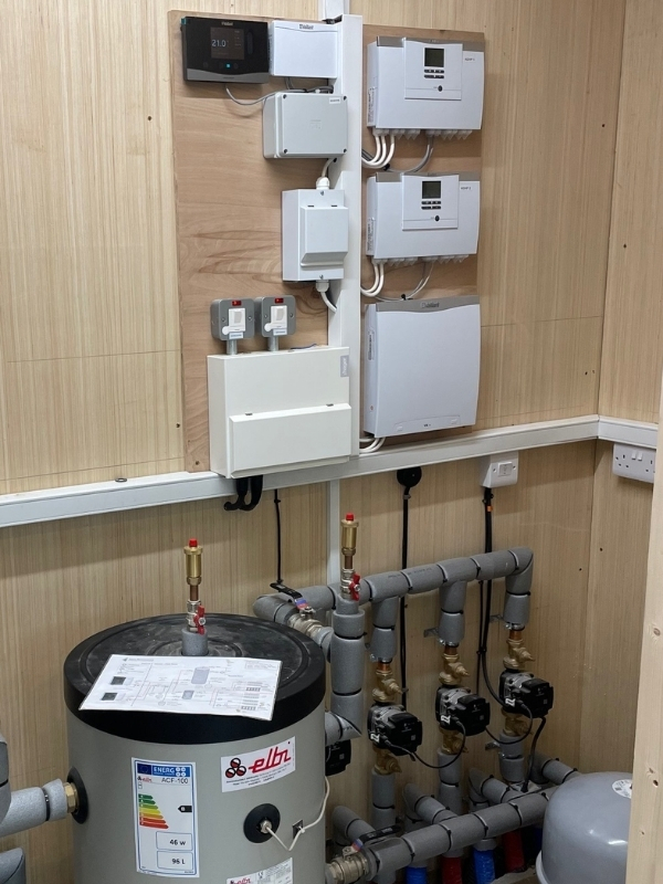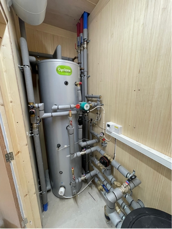 A 500L buffer tank allows for on/off demands while protecting the heat pumps from short-cycling and maintains system efficiency. The property’s limited hot water needs are handled by a 300L cylinder. A full Building Management System provides centralised control of the entire heating circuit.