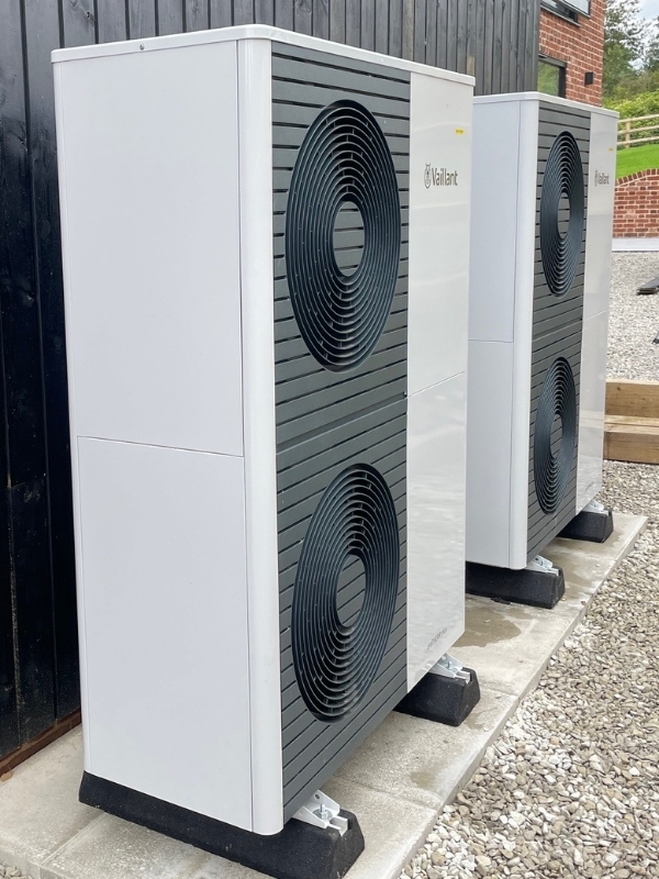 The specified system centres on two Vaillant aroTHERM plus 10kW air-source heat pumps, delivering 20kW of combined renewable heat output.