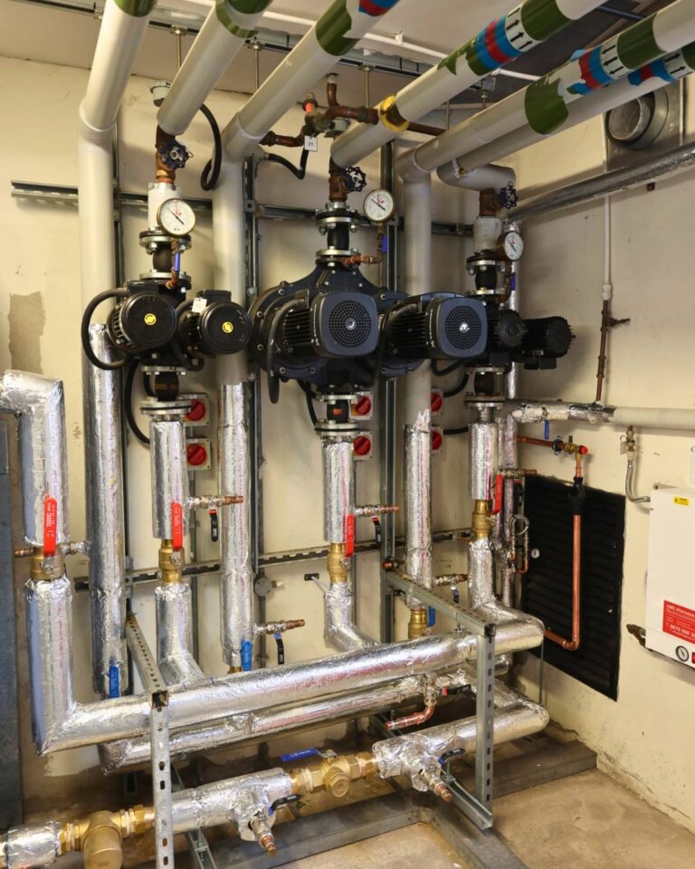 Spire Renewables delivered the full system design package: mechanical schematics, electrical designs, pipework layouts, pipework sizing, emitter sizing, and fitting allocations.