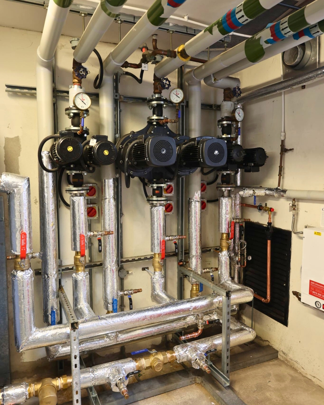 Madley Renewables carried out the complete mechanical installation – full plant room strip-out, pipework replacement, radiators throughout, rooftop unit lifting. Spire completed the electrical installation.